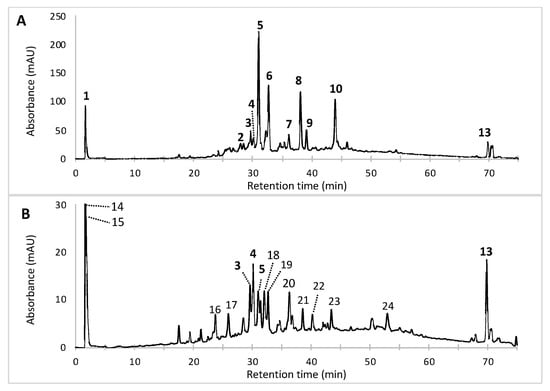 Chromatograms of the overall compounds detected by HPLC-DAD in the samples obtained by pressurized liquid extraction (PLE) using 50% aqueous ethanol as extraction solvent from the mycelium of the marine-derived Talaromyces sp. 30570 strain cultivated in submerged culture: (A) in Potato Dextrose Broth (PDB); and (B) in Defined Minimal Dextrose broth (DMD). Assignment of the polyketide-based compounds were done by UV-visible spectra and HRMS according to their mass to charge ratio. See Table 2 for the identification of the molecules.