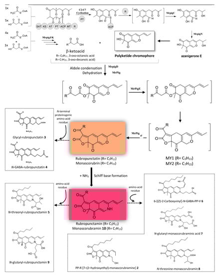 - Chen, W.; Feng, Y.; Molnár, I.; Chen, F. Nature and nurture: Confluence of pathway determinism with metabolic and chemical serendipity diversifies: Monascus azaphilone pigments. Nat. Prod. Rep. 2019, 36, 561–572. [Google Scholar] [CrossRef]
