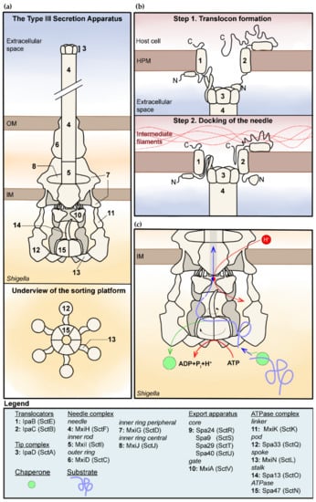 Structure and function of the type III secretion apparatus (T3SA) in Shigella spp. (a) Overview of the structure of the inactive T3SA. Note that the tip complex and cytosolic components of the T3SA are represented with a 3D perspective while the body is represented as a flat longitudinal cross section [,,,]. The bottom panel represents the sorting platform viewed from the cytosol of the bacterium. (i.e., viewed from the underside). (b) Model for the formation of the translocon and mutual interaction with the tip complex, the host plasma membrane, and the intermediate filaments [,]. (c) This is a model for the secretion of T3SA substrates summarizing elements discussed in the text. It indicates the role of the chaperone and ATPase–stalk complex in the unfolding of the substrates (purple) through rotation induced by ATP hydrolysis [,], and of the gate of the export apparatus in the creation of a proton motive force required for substrates secretion [,]. Movement is represented by dashed arrows; rotation is represented by curved arrows. The coupling of the protein substrates–proton antiporter is represented by the red–blue circle. The legend indicates the name of the various components in Shigella and in the unified nomenclature in parentheses.