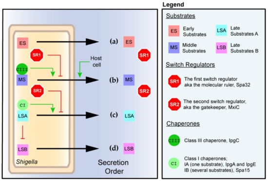 Concurrently with the exhaustion of the middle substrate store, MxiC is secreted [,]. The needle was suggested to play a critical signaling role in the trigger of the secretion of MxiC []. The depletion of the cytosolic store of MxiC allows MxiA to secrete the late substrates []. The late substrates A, which are stored in the cytosol prior to T3SA activation, possess a secretion signal and their own chaperones, which belong to a different structural class than their translocator-binding counterpart []. Hence, it was proposed that the structural diversity of chaperones contributes to establishing the secretion hierarchy through their binding with varying affinity to the ATPase []. This phenomenon may also be modulated by MxiC. By contrast, the late substrates B, which are only produced following the secretion of late substrates A (Figure 2d and next section), are unchaperoned and secreted as soon as produced []. This suggests that the secretion signal suffices for the secretion of late substrate B and that their transcription serves merely as another manner of hierarchizing secretion further.