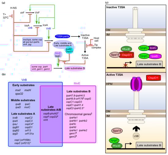 The regulation of the production of proteins encoded by T3SS genes intervenes mostly at the transcriptional level. The T3SS regulatory cascade is composed of a repressor named the histone-like nucleoid structure protein (H-NS), and of three transcription activators named VirF (AraC-family), VirB (ParB family), and MxiE (AraC family) (Figure 3a) []. The first three players coordinate the transcriptional response to the rise of temperature occurring upon Shigella’s transition from an external environment to its host. The interaction between these factors and DNA culminates with the production of VirB, which activates the expression of most T3SS genes, hence ensuring that the T3SA is assembled in the Shigella membrane only when it is inside its host. The last transcription activator MxiE senses the presence of host cells using T3SA activity as a proxy. Indeed, MxiE is inhibited at the posttranslational level when T3SAs are inactive. This inhibition is released when T3SAs are active, allowing MxiE to upregulate the expression of genes encoding late substrates B. Finally, a handful of genes called late substrates A/B are dually controlled by VirB- and MxiE-dependent promoters [,] (Figure 3b). Below, we detail the action of these different transcription factors in the regulation of the main virulence genes.
