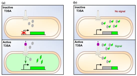 The types of assays to measure the activity of the T3SA. (a) Transcription-based assays. The activation of T3SAs upregulate the expression of the reporter gene, thus leading to an increased production of the corresponding assay proteins. The relative secretion activity is then estimated by the measurement of the fluorescence or of any other relevant signal emitted by the assay protein (e.g., luminescence, colorimetric, etc.). (b) Secretion-based assay. Upon activation of the T3SA, T3SA substrates fused to a specific tag are secreted. The relative amount and location of the substrates inside host cells or in the extracellular medium are measured with the relevant method, as described in (a).
