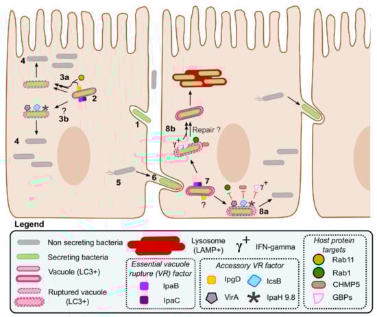Shigella spp. enter host cells using an invasion mechanism shared with some bacteria expressing a T3SS such as Salmonella enterica []. Indeed, both bacteria force their entry into epithelial cells by manipulating the actin cytoskeleton. As in phagocytosis in macrophages, this results in the formation of a bacteria-containing vacuole. While intracellular S. enterica adopts a vacuolar lifestyle thereafter, Shigella ruptures its vacuole to access the cytosol of its host cell (Figure 5). Then, using IcsA to form actin comets, it initiates cytosolic movement in order to invade neighboring cells []. This process named cell-to-cell spread consists of: (1) the formation of a finger-like protrusion by a Shigella cell whose movement deforms the plasma membrane of the initially infected host cell and a neighboring cell; (2) the release of this Shigella cell into the cytosol of the neighboring host cell through the maturation of the protrusion into a dissemination vacuole and the rupture of the latter.