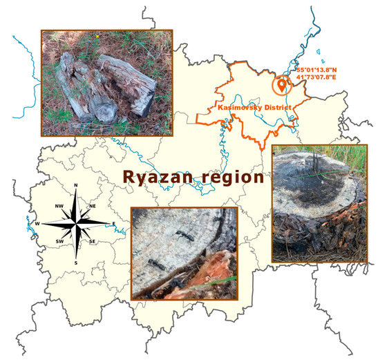 The Camponotus vagus ants (black carpenter ants) are widespread across Europe (north to south of Sweden and Finland), in the Caucasus, in northern Kazakhstan, Western Siberia to Altai, and also in northwest Africa. They usually inhabit the edges and clearings of deciduous forests or pine forests, with nests in old stumps and other woody remains [45]. Unlike termites, carpenter ants do not feed on wood but use it to build nests, carving out passages and chambers. In addition, nests usually have an underground part. Camponotus vagus, like other ants of this genus, consume live or dead insects that provide protein, but mainly feed on high-carbohydrate substrates, such as “honeydew” produced by aphids, floral nectar, sometimes honey and sweet fruits.