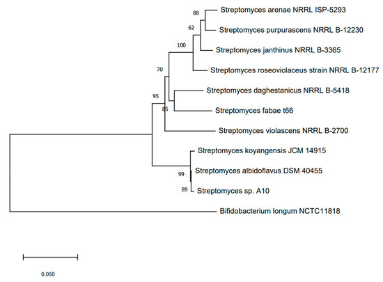 The resultant sequences of the 16S rRNA gene were manually aligned against the corresponding sequences of representatives of the genus Streptomyces using MEGA X [28] software (https://www.megasoftware.net/). Phylogenetic trees were inferred using the Neighbor-Joining (NJ) and Maximum-Likelihood (ML) tree-making algorithms. The GenBank accession number for the 16S rRNA gene sequence of Streptomyces sp. strain A10 is MW165475.