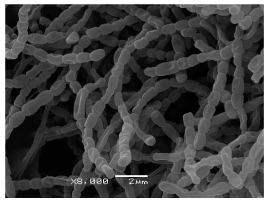 Scanning electron microscopy of strain A10 grown on ISP3 media for 8 days at 28 °C.