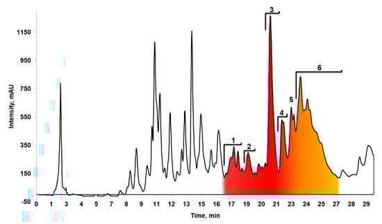 Analytical reverse-phase high-performance liquid chromatography (RP-HPLC) analysis of the antifungal fraction of Streptomyces sp. strain A10. Fractions 1–6 exhibited antifungal activity against Candida albicans and were collected for further analysis.