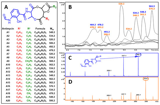 Structural identification of antimycins: (A) structures of antimycin A depsipeptides; (B) MS analysis of the obtained fractions, masses correspond to unprotonated molecules, the blue masses indicate the typical antimycin fragmentation pattern (C), the orange masses correspond to the 14 Da-shifted fragmentation pattern (D).