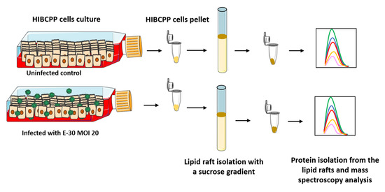 Schematic representation of the lipid raft isolation of HIBCPP (Human Immortalized Choroid Plexus Papilloma) cells. HIBCPP cells were infected with E-30 (Echovirus-30) for 24 h at a MOI (Multiplicity of infection) of 20. Subsequently, the cells were pelleted, and the lipid rafts were isolated using a sucrose gradient [29]. Finally, the protein content of the lipid raft fraction was extracted and analyzed by mass spectrometry. The HIBCPP cells are infected with E-30 on their apical side.