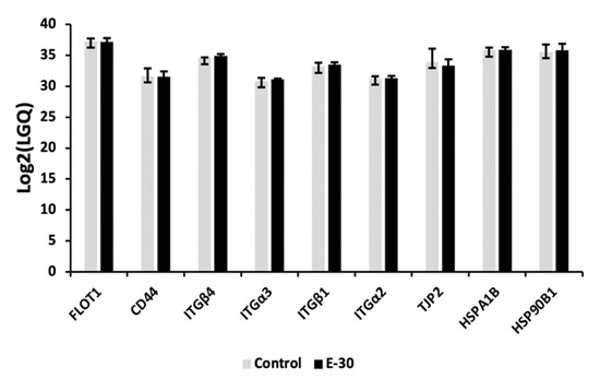 In the next step, we infected HIBCPP cells with E-30 at MOI 20 for 24 h and performed the lipid raft isolation, and further analyzed the proteins present in the lipid rafts by mass spectroscopy. At first, we confirmed the presence of typical lipid rafts proteins in our samples (Figure 3). A high proportion of proteins such as FLOT1 flotillin-1, integrins such as ITG4, ITGα3, ITGβ1, ITGα2, and heat shock proteins such as HSPA1B and HSP90B1 were present in our samples (Figure 3).