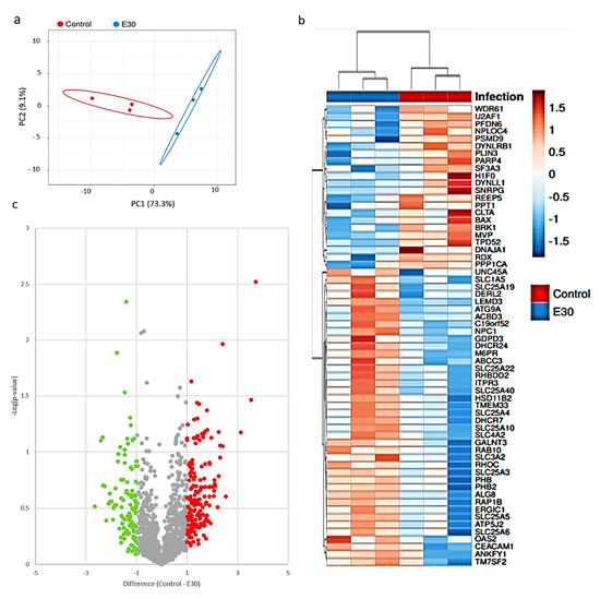 E-30 infection of HIBCPP cells alters the abundance of protein at the lipid raft micro-domains. (a) Plot of the principal component analysis (PCA) for the uninfected samples (red) versus E-30 MOI 20 (blue). (b) Heatmap representing the significantly up-regulated (in red) and down-regulated (in blue) proteins of HIBCPP cells infected with E-30 MOI 20 versus uninfected control. Proteins with a p-value < 0.01, and a |log2FC| > 1 were considered as differentially expressed. (c) Volcano plot representing proteins found to be down-regulated (in green) and up-regulated (in red) when comparing the uninfected control versus E-30 MOI 20 infected cells. Proteins in gray are not significantly changed. Proteins with a t-test p-value lower than 0.01, and an absolute difference greater than 1 were considered as differentially expressed. Statistical analysis was performed using Perseus framework (version: 1.5.2.4).