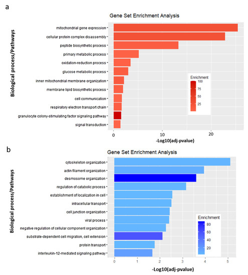 Enriched pathways in HIBCPP cells following E-30 infection versus uninfected control. (a) Top 12 significantly up-regulated pathways in HIBCPP cells infected with E-30 compared to uninfected control. Analysis was performed using Gene Ontology enrichment tool (GOTE). The shade of red is representative of the grade of pathway enrichment. (b) Top 12 significantly down-regulated pathways in E-30 infected HIBCPP cells compared to uninfected control. The shade of blue is representative of the grade of enrichment. Data are shown for 3 independent experiments. Analysis was performed using Gene Ontology enrichment tool and resulted in a binomial statistic p-value and pathway fold enrichment (calculated as suggested by [31]).