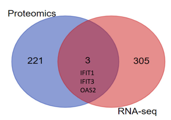 A previous study of our laboratory on E-30 infection of the HIBCPP with MOI 20 revealed a strong impact of the virus at the RNA level [28]. We compared the differentially expressed genes after E-30 infection in HIBCPPP with the new proteomic results. Among the 308 differentially expressed genes and the 224 differentially abundant proteins in the lipid raft, we could identify three genes/proteins up-regulated following E-30 infection in both assays; IFIT1, IFIT3, and OAS2 (Figure 6).