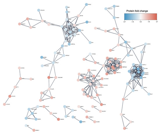 STRING interaction analysis of the 224 differentially abundant proteins using Cytoscape software. The identifiers for the 224 proteins from Supplemental Tables S1 and S2 were entered into the Cytoscape database showing the interaction network. The confidence level was set to high. The color indicates the protein fold change.