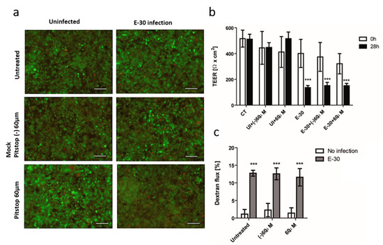 Blocking of dynamin-mediated endocytosis with Pitstop-2 has no impact on the loss of barrier properties of HIBCPP cells following E-30 infection. (a) Pitstop-2 and E-30 infection have no drastic impact on HIBCPP cells viability. Live/dead assay stains living cells in green and dead cells in red. Pictures show representative images from 3 independent experiments, each performed in duplicates, for the following conditions (uninfected untreated (CT), uninfected negative control of Pitstop-2 at 60 µM condition ((−)60 µM), uninfected Pitstop-2 at 60 µM condition (60 µM), E-30 infection and no blocking (E-30), negative control of Pitstop-2 at 60 µM + E-30 infection (E-30 + (−) 60 µM), Pitstop-2 at 60 µM in + E-30 infection (E-30 + 60 µM). (b) TEER decrease after E-30 infection in presence or absence of Pitstop-2. TEER was measured at T = 0 h (white bars) and T = 28 h (black bars) of the blocking with Pitstop-2, for all the conditions. (c) Increased dextran flux following E-30 infection in presence or absence of Pitstop-2. Quantification via fluorescent measurement of paracellular flux with dextran-TexasRed (MW 1000 Da), from T = 24 h to T = 28 h of blocking with Pitstop-2, for all the conditions. Statistical significance was calculated using Student’s t-test. p values are displayed as follows: *** p < 0.001. White scale bars represent 100 µM.
