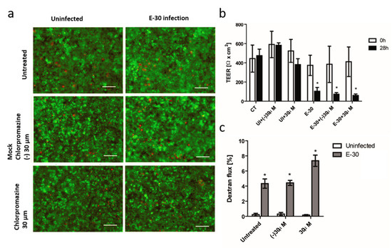 Blocking of clathrin-mediated endocytosis with chlorpromazine has no impact on the loss of barrier properties of HIBCPP cells following E-30 infection. (a) Chlorpromazine and E-30 infection have no drastic impact on HIBCPP cells viability. Live/dead assay stains living cells in green and dead cells in red. Pictures show representative images from 3 independent experiments, each performed in duplicates, for the following conditions; control no E-30 infection and no blocking (CT), negative control of chlorpromazine at 30 µM in uninfected condition (UI + (−) 30 µM), chlorpromazine at 30 µM in uninfected condition (UI + 30 µM), E-30 infection (E-30), negative control of chlorpromazine at 30 µM in E-30 infection (E-30 + (−) 30 µM), chlorpromazine at 30 µM in E-30 infection (E-30 + 30 µM). (b) TEER decrease after E-30 infection in presence or absence of chlorpromazine. TEER was monitored at T = 0 h (white bars) and T = 28 h (black bars) of the blocking with chlorpromazine, for all the conditions. (c) Increased dextran flux following E-30 infection in presence or absence of chlorpromazine. Quantification via fluorescent measurement of paracellular flux with dextran-TexasRed (MW 1000 Da), from T = 24 h to T = 28 h of blocking with chlorpromazine for all the conditions. Statistical significance was calculated using Student’s t-test. p values are displayed as follows: * p < 0.01. White scale bars represent 100 µM.