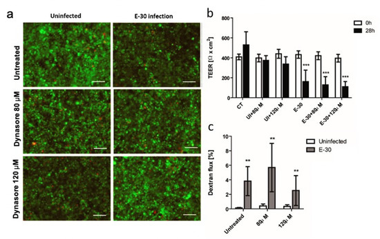 Blocking of dynamin-mediated endocytosis with Dynasore has no impact on the loss of barrier properties of HIBCPP cells following E-30 infection. (a) Dynasore and E-30 infection have no drastic impact on HIBCPP cells viability. Live/dead assay stains living cells in green and dead cells in red. Pictures show representative images from 3 independent experiments, each performed in duplicates for the following conditions: uninfected and untreated (CT), 80 µM of Dynasore in uninfected condition (UI + 80 µM), 120 µM of Dynasore in uninfected condition (UI + 120 µM), E-30 infection no blocking (E-30), 80 µM of Dynasore and E-30 infection (E-30 + 80 µM), and 120 µM of Dynasore and E-30 infection (E-30 + 120 µM). (b) TEER decrease after E-30 infection in presence or absence of Dynasore. TEER was monitored at T = 0 h (white bars) and T = 28 h (black bars) of blocking with Dynasore, for all the conditions. (c) Increased dextran flux following E-30 infection in presence or absence of Dynasore. Quantification via fluorescent measurement of paracellular flux with dextran-TexasRed (MW 1000 Da), from T = 24 h to T = 28 h of blocking with Dynasore for all the conditions. Statistical significance was calculated using a Student’s t-test. p values are displayed as follows: ** p < 0.05 and *** p < 0.001 was reached comparing the mean of uninfected values ± blocking with the corresponding values in E-30 infection. White scale bars represent 100 µM.