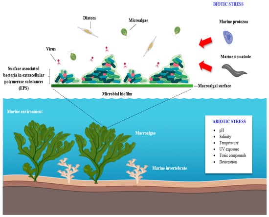 Marine inhabitants, particularly microorganisms, are continuously exposed to multiple detrimental interactions imposed by competitors and predators [,] and different physical–chemical variables such as fluctuating temperature, pH, UV exposure, salinity, toxic compounds and desiccation, particularly in the intertidal zone [,,]. As a survival strategy, some marine bacteria adhere to each other and/or surfaces and are embedded in enclosed matrices to form a biofilm (Figure 1) [,].