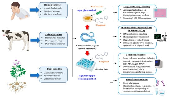 Schematic diagram representing the functional role of C. elegans as a model nematode for the development of antinematode drugs. The propagation and handling methods of human, animal or plant-parasitic nematodes in the laboratory are challenging. C. elegans can be used as a surrogate nematode for the initial screening against the potential compounds or microorganisms with nematotoxic properties either via the conservative agar plate method or through high throughput screening technologies. C. elegans-based research offers several advantages including nematode genetic manipulation, determination of drug MOA, evaluation of the resulting nematode responses and a large-scale initial drug screening due to easy nematode maintenance and propagation in the laboratory. Image created with BioRender.com.