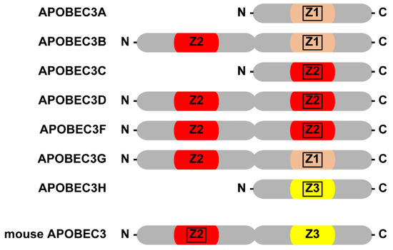 Figure 1. Z-domains of human APOBEC3s and mouse APOBEC3. Z1, Z2, and Z3 are shown by different colors and enzymatic active ones are marked by square box.