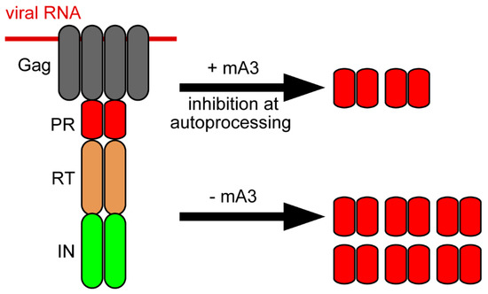 Recently, it has been shown that the P50 protein, which is translated from an alternative spliced MuLV gag RNA, binds mA3 in cells and inhibits its incorporation into viral particles [180]. Since not all mA3 might be bound by P50 in cells, it is possible that mA3, which is not captured by P50, is incorporated into viral particles and interferes with the autoprocessing of Pr180gag-pol. The autoprocessing dysregulation by mA3 results in inhibition of Pr65gag processing and then of viral core formation. MuLV glycosylated Gag (glyco-Gag) stabilizes viral cores and protects reverse transcription complex from attack by mA3 [181]. The inhibitory effect of mA3 on autoprocessing precedes the glyco-Gag function in the virus life cycle.