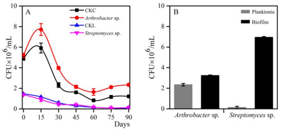 Growth and biofilm formation of Arthrobacter sp. and Streptomyces sp. in the presence of polyethylene (PE) films as a sole carbon source. (A) Colony-forming units (CFU) of planktonic bacteria. CKC and CKL indicate Czapek–Dox medium and liquid carbon-free basal medium without PE film and with Arthrobacter sp. and Streptomyces sp., respectively. (B) CFU of bacteria in planktonic culture and on biofilms formed on the surface of plastic film at day 90. Bars indicate the mean ± SE (n = 3).