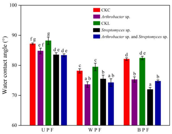 Effects of a 90-d bacterial incubation on the water contact angle (WCA) of polyethylene films. UPF (unpretreated plastic film). WPF (weathered plastic film). BPF (buried plastic film). CKC and CKL are control plastic films that were not incubated with bacteria in Czapek–Dox and liquid carbon-free basal medium, respectively. Bars indicate the mean ± SE (n = 3), and bars with different letters are significantly different (p < 0.05, two-way ANOVA and Fisher’s protected LSD test).