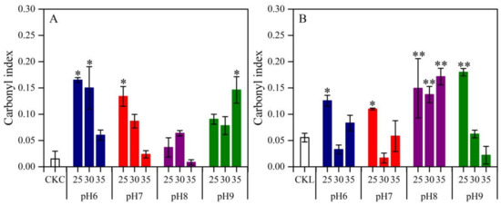 Effect of pH (6–9) and temperature (25–35 °C) on polyethylene film carbonyl index in the presence of Arthrobacter sp. (A) and Streptomyces sp. (B). CKC and CKL indicate polyethylene film without bacteria in Czapek–Dox and liquid carbon-free basal medium at 25 °C in pH 7, respectively. Bars indicate the mean ± SE (n = 3), and bars with asterisk differ significantly from CKC (A) or CKL (B). * p < 0.05, ** p < 0.01.