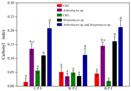 Effects of bacterial incubation for 90 days on the carbonyl indices of polyethylene films. UPF, WPF, and BPF are defined in Figure 2. The abbreviations CKC and CKL are also the same as those used in Figure 2. Bars indicate the mean ± SE (n = 3), and bars with different letters are significantly different (p < 0.05, two-way ANOVA and Fisher’s protected LSD test).
