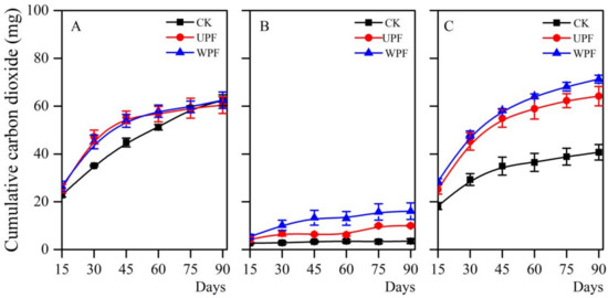 CO2 is the final metabolic product of PE that was provided as the sole carbon source, and its evolution was therefore monitored (Figure 8). Compared with the presence of bacteria only, the addition of PE (UPF or WPF) led to much higher CO2 evolution for strain Arthrobacter sp., particularly during the experiment period of 60 days (Figure 8A) and a maximum of about 60 mg of CO2 cumulated was detected. More CO2 was also observed to accumulate when the Streptomyces sp. strain was grown with PE film (Figure 8B). Cumulative CO2 evolution of 10.0 ± 0.4 and 16.1 ± 3.5 mg was detected for UPF and WPF, respectively, and was very low only in the presence of single bacterial species grown without film (3.5 ± 1.0 mg). Surprisingly, the rate and magnitude of CO2 evolution were very high for the bacterial consortium (Figure 8C). Cumulative CO2 of 64.2 ± 4.0 and 71.3 ± 1.7 mg were detected for UPF and WPF, respectively, and 40.7 ± 3.3 mg for the only consortium bacteria grown without film. These results provide strong evidence that the microbial consortium is more effective at PE degradation than either of its constituent microorganisms. Considering that these great differences might be caused by functional masterbatch of PE that is an easily utilized carbon-containing component, the CO2 evolution from individual LLDPE, LDPE, or functional masterbatch were determined. Result showed that CO2 evolution was also markedly higher for the LLDPE or LDPE (Figure S3), suggesting that PE, not the functional masterbatch, was responsible for the enhanced CO2 evolution driven by the bacteria.