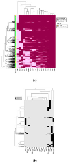 (a) Antimicrobial susceptibility profile and (b) gene detection heatmap for 660 carbapenem-nonsusceptible Enterobacteriaceae isolates. Abbreviations: AMK, amikacin; GEN, gentamicin; SXT, trimethoprim/sulfamethoxazole; IMP, imipenem; DOR, doripenem; MEM, meropenem; FEP, cefepime; LEV, levofloxacin; CIP, ciprofloxacin; ATM, aztreonam; TZP, piperacillin–tazobactam; ETP, ertapenem; FTX, cefotaxime; CAZ, ceftazidime; FOX, cefoxitin; FRX, ceftriaxone; CFZ, cefazolin; AMP, ampicillin. Indicated are negative and positive PCR detection results for each gene.