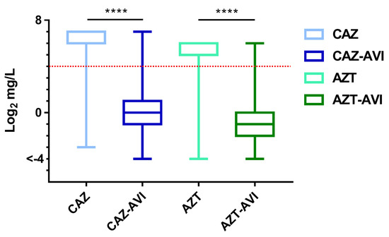MIC distribution box plots for the four regimens tested in this study. Red dotted line indicates resistance breakpoints for each agent according to CLSI guidelines. From top to bottom, horizontal lines indicate maximum, third quartile (Q3, 75%), medium (50%), first quartile (Q1, 25%), and minimum MIC values. Abbreviations: CAZ, ceftazidime; CAZ-AVI, ceftazidime with avibactam; AZT, aztreonam; AZT-AVI, aztreonam with avibactam. ****, p < 0.0001.