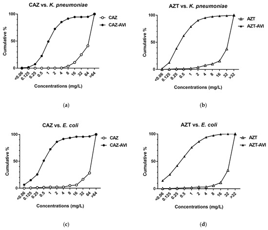 Cumulative MIC susceptibility curves are shown in Figure 3. Among the CnsKP isolates, ceftazidime and aztreonam susceptibility percentages were 0.4% (2/472) and 7.4% (35/472), respectively (Figure 3a,b). Leftward shifts were noted in 85.2% (402/472) of the same isolates following treatment with the ceftazidime–avibactam combination, and in 95.3% (450/472) following treatment with the aztreonam–avibactam combination (Figure 3a,b). Among the 188 CnsEC isolates, susceptibility values for ceftazidime and aztreonam monotherapies were 2.1% (4/188) and 3.2% (6/188), respectively (Figure 3c,d). Ceftazidime and aztreonam susceptibility values decreased to 91.5% (172/188) and 94.1% (177/188) when combined with avibactam, also respectively (Figure 3c,d). Combined, our data suggest that avibactam restored the antibacterial efficacies of ceftazidime and aztreonam.