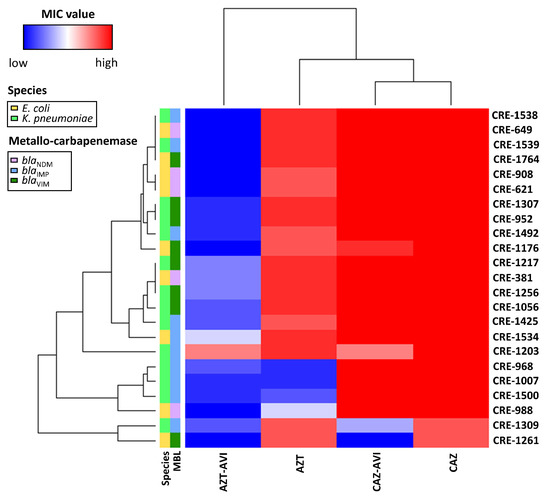 Low antibacterial activity for the combination of ceftazidime with avibactam was observed in 23 class B metallo-carbapenemase producers (Table 1). The heatmap shown as Figure 4 presents MIC values for all 23, along with their species and carbapenemase classifications. Among them, blaIMP and blaVIM were found in 9 and 5 CnsKP isolates, respectively, and blaIMP, blaVIM and blaNDM were found in 1, 3, and 5 CnsEC isolates, also respectively (Figure 4). Similar MIC patterns were observed for ceftazidime alone and ceftazidime with avibactam, indicating weak effectiveness against metallo-carbapenemase producers. In contrast, strong in vitro activity against the same isolates was observed for the combination of aztreonam with avibactam.