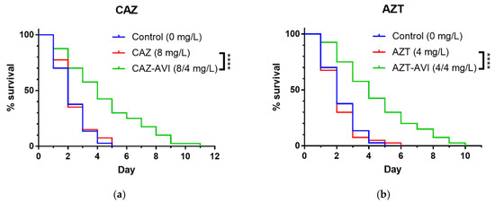 C. elegans survival curves. Infected nematodes (n = 40) were treated with (a) ceftazidime or ceftazidime with avibactam, (b) aztreonam or aztreonam with avibactam. Nematodes were consistently treated with avibactam at a concentration of 4 mg/L. Abbreviations: CAZ, ceftazidime; CAZ-AVI, ceftazidime with avibactam; AZT, aztreonam; AZT-AVI, aztreonam with avibactam. ****, p < 0.0001.