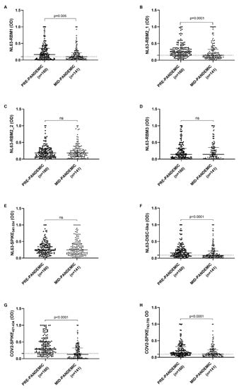 Figure 1F); while 120 pre-pandemic patients out of 160 (75%) and 69 mid-pandemic patients out of 141 were positive (48.9%) for NL63-RBM2_1 (