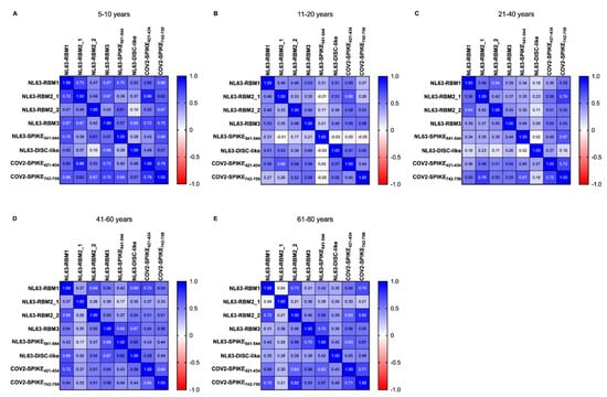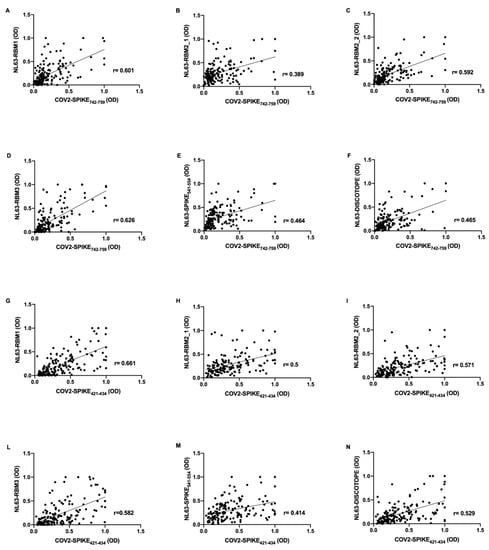 p < 0.0001). Moderate correlations were also found among different peptides recognizing different epitopes of HCoV-NL63 S-protein, particularly NL63-DISC-like and NL63-RBM1 (