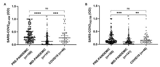 421–434 peptide shows 128 positive patients out of 160 (80%) in pre-pandemic population and 60 positive patients out of 141 (42.5%) in mid-pandemic population (