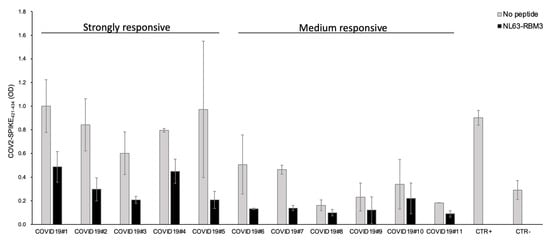 From these results, 11 COVID19 patients were selected based on the plasma antibody response against the COV2-SPIKE421–434 peptide (five strong and six medium responders). All the strongly responsive patients showed outstanding antibody cross-reactivity with a noticeable reduction of the antibody reaction after the incubation with NL63-RBM3 peptide.