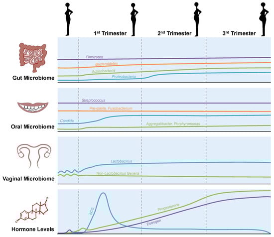 General changes in the gut, oral, and vaginal microbiomes in parallel with the hormonal changes throughout pregnancy. The changes that occur in the gut throughout pregnancy are complex and mediated by maternal factors, such as diet and antibiotic usage. The vaginal microbiome during pregnancy becomes more stably dominated by species of Lactobacillus, thereby decreasing in overall diversity.