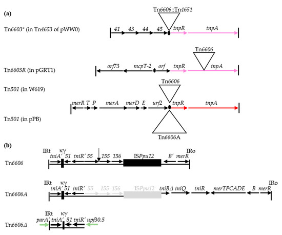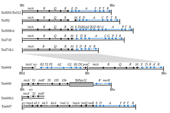 - Petrovski, S.; Blackmore, D.W.; Jackson, K.L.; Stanisich, V.A. Mercury(II)-resistance transposons Tn502 and Tn512, from Pseudomonas clinical strains, are structurally different members of the Tn5053 family. Plasmid 2011, 65, 58–64. [Google Scholar] [CrossRef]