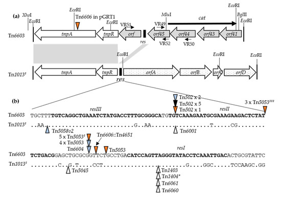 - Petrovski, S.; Stanisich, V.A. Tn502 and Tn512 Are res site hunters that provide evidence of resolvase-independent transposition to random sites. J. Bacteriol. 2010, 192, 1865–1874. [Google Scholar] [CrossRef] [PubMed]