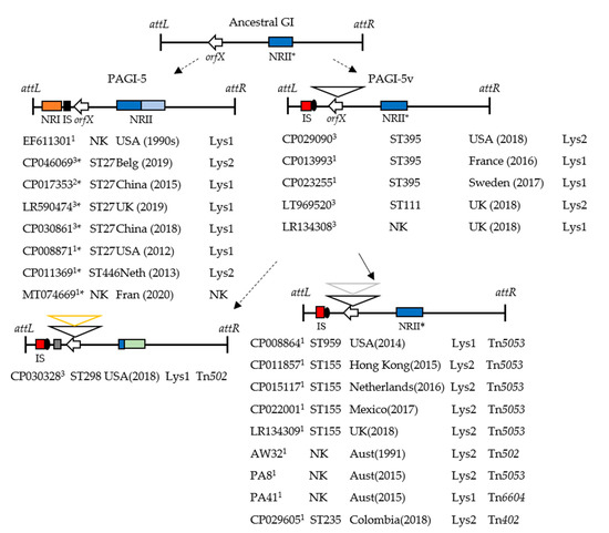 - Qiu, X.; Gurkar, A.U.; Lory, S. Interstrain transfer of the large pathogenicity island (PAPI-1) of Pseudomonas aeruginosa. Proc. Natl. Acad. Sci. USA 2006, 103, 19830–19835. [Google Scholar] [CrossRef]