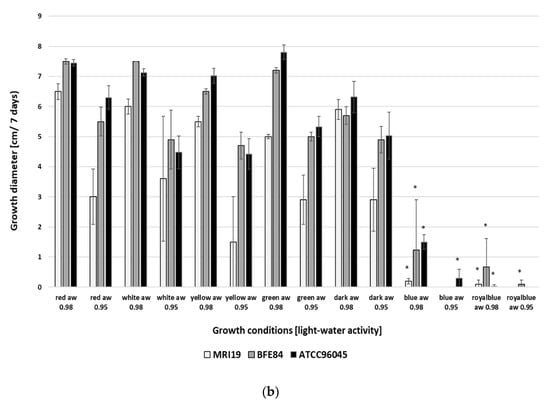 (a) Phenotypic growth of the analyzed Aspergillus isolates dependent on different combinations of light and water activity. (b) Growth rates of the analyzed Aspergillus isolates dependent on different combinations of light and water activity. Standard deviations are given for each parameter. * = The growth was significantly reduced in relation to the control (dark).