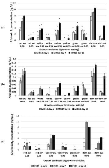 The influence of combinations of two different water activities (aw) and light with five different wavelengths plus white light on the growth of A. flavus MRI19, A. flavus ATCC96045 and A. parasiticus BFE84 was analyzed. These two environmental influencing factors are of particular importance with regard to global warming and the natural habitat of aflatoxigenic fungi, which is even now often exposed to light and drought stress. The strains were inoculated on PDA adjusted to aw 0.98 and aw 0.95 with glycerol and incubated at 25 °C under the influence of different wavelengths of light. Figure 1a,b shows the phenotypic and quantitative growth differences of the three Aspergillus isolates under different combinations of light and water activity. The growth of the three aspergilli analyzed was generally reduced, with lower water activity in the growth media. This is in accordance with the findings of Gibson et al. [], who showed that Aspergillus grows particularly well at moderate temperatures and high water activity conditions. Experiments with other fungal species, mainly from the genus Penicillium, showed that both growth and mycotoxin production on substrates without adaption of the water activity were strongly influenced by the influence of different light wavelengths alone [,,]. Sporulation and the formation of mycelia were also significantly affected in this context. The combination of slight drought stress, which is mimicked by the lower water activity of the substrate, together with light radiation, however, shows a clear promotion of the inhibition of growth for the analyzed Aspergillus species. In particular, a water activity of aw 0.95 in the growth substrate, together with short-wave light radiation (455/470 nm), led to a significant reduction or even a complete cessation of fungal growth. However, some of the spores showed an increased tolerance to drought stress and short-wave light radiation because they survived the procedure, and this led to tiny colonies after prolonged incubation (data not shown). These adapted spores which showed a higher resilience were positively selected by the harmful growth conditions particularly in case of the species A. parasiticus. A. parasiticus BFE84 and the non-aflatoxin producing strain A. flavus ATCC96045 showed higher growth rates under the given conditions than the aflatoxin-producing A. flavus strain MRI19. In general, longer wavelengths (530/627 nm) appear to support the growth of the fungi, whereas incubation under short wavelengths (455/470 nm) reduced growth persistently over an observation period of at least two weeks.