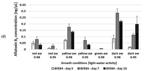 The combination of moderate drought stress and different light wavelengths also showed a substantial effect on mycotoxin production, as shown in Figure 2 and Figure 3. Under the influence of only one parameter—light or water activity—mycotoxin formation was less affected. The combined effect of both influencing factors—short-wave light (455/470 nm) together with lower water activity (aw 0.95)—however, leads to a significant reduction in growth and a complete inhibition of mycotoxin formation. The aflatoxin B1/B2 formation of the A. flavus MRI19 and A. parasiticus BFE84 isolates over a period of ten days is shown in Figure 2a–d and the formation of aflatoxin G1/G2 by A. parasiticus is shown in Figure 3a,b. The highest aflatoxin concentrations could be measured in the growth of Aspergillus without light radiation. This leads to the assumption that aflatoxin formation in the dark is preferred and that aflatoxin obviously does not help to compensate for the harmful effects of light radiation, as described in the case of the mycotoxin citrinin produced by P. verrucosum [,]. Incubation under long-wave light (627 nm, red light) leads to a good reduction in aflatoxin formation of about 20% compared to dark conditions. However, the sporulation, mycelial phenotypical habitus and mycotoxin formation were still most similar to the samples incubated in the dark, followed by samples incubated at medium wavelengths. Under white, yellow and green light (depending on the fungal strain) the mycotoxin concentration was reduced even further. This observation differs from the results of Moussa et al. [], who described an induction of aflatoxin B1 formation in A. flavus irradiated with white light. The reason for this discrepancy could be that they did not use LED light, which is more monochromatic “cold-white” light compared to Edison lightbulbs, which emit more yellow “warm white” light. Other groups found that white light harms the formation of sclerotia in A. flavus growing in liquid medium and to some extent the production of secondary metabolites [,]. It is already known that the reaction of the fungus to light depends on physical parameters associated with light such as the wavelength, the intensity, the duration of the radiation and thus the energy to which the fungus is exposed [,]. In addition, fungi that are well adapted to highly UV-exposed habitats such as melanin- or carotenoid-pigmented fungi that occur in crop fields in parallel with Aspergillus may be less sensitive to light radiation.