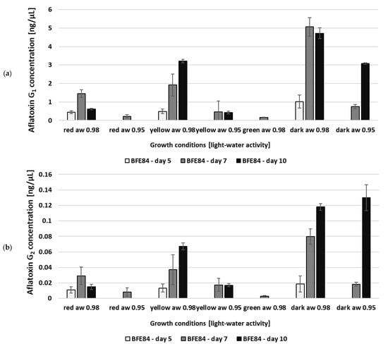 Aflatoxin G1 (a) and G2 (b) formation by Aspergillus parasiticus BFE84, dependent on different combinations of light and water activity. No aflatoxin formation was detectable under white light, aw 0.98 and aw 0.95; green light and aw 0.95; and blue/royal blue light. Standard deviations are given for each parameter. The measured values were too low for statistical significance analysis.