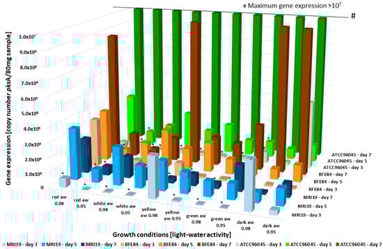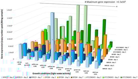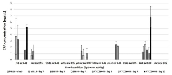 The gene expression analysis with the key gene for CPA formation, cpaA, a hybrid polyketide synthase/non-ribosomal peptide synthase gene [], showed increased transcription activity in the strain A. flavus ATCC96045 (Figure 6) from the beginning. It is noteworthy that the gene expression under yellow light radiation and aw 0.95 was high, whereas no CPA could be detected by HPLC. This suggests that some post-translational mechanisms could hinder CPA formation in a certain step of the biosynthesis, which again shows that the regulation of mycotoxin formation is a very complex process [].