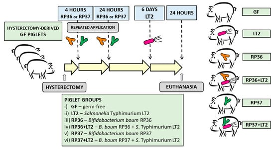 Each piglet group was composed of 3 independent hysterectomies. A total of 36 gnotobiotic piglets were assigned to 6 groups with 6 piglets per group (Figure 1): (i) Germ-free for the whole experimental period (GF); (ii) 1-week-old GF piglets orally infected with 6 log CFU of S. Typhimurium for 24 h (LT2); (iii) orally colonized with 8 log CFU of RP36 4 h and 24 h after hysterectomy (RP36); (iv) 1-week-old RP36 piglets orally infected with 6 log CFU of LT2 for 24 h (RP36+LT2); (v) orally colonized with 8 log CFU of RP37 4 h and 24 h after hysterectomy (RP37); (vi) 1-week-old RP37 piglets orally infected with 6 log CFU of LT2 for 24 h (RP37+LT2). The bacteria were applied orally in 5 mL of a milk diet, and GF piglets obtained 5 mL of milk only without bacteria. Twenty-four hours after the challenge with Salmonella (LT2, RP36+LT2, and RP37+LT2), the piglets were euthanized by exsanguination via cardiac puncture under isoflurane anesthesia. Their non-infected counterparts GF, RP36, and RP37, proceeded in the same way at the same age.