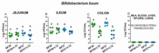 No differences between B. boum alone (RP36 and RP37) and in the presence of S. Typhimurium (RP36+LT2 and RP37+LT2) were found in the jejunum (Figure 2A) and ileum (Figure 2B). In the colon (Figure 2C), the presence of S. Typhimurium in RP36+LT2 and RP37+LT2 groups statistically significantly decreased the counts of both B. boum strains (Figure 2C). The presence of S. Typhimurium did not cause B. boum bacteremia or its translocation into observed organs (Figure 2D).